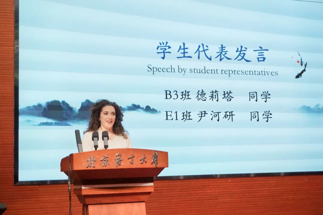 接下来教师代表蔡楠老师、学生代表德莉塔和尹河研也做了本学期的总结汇报,强调了学习、友情和生活等方面的重要收获。