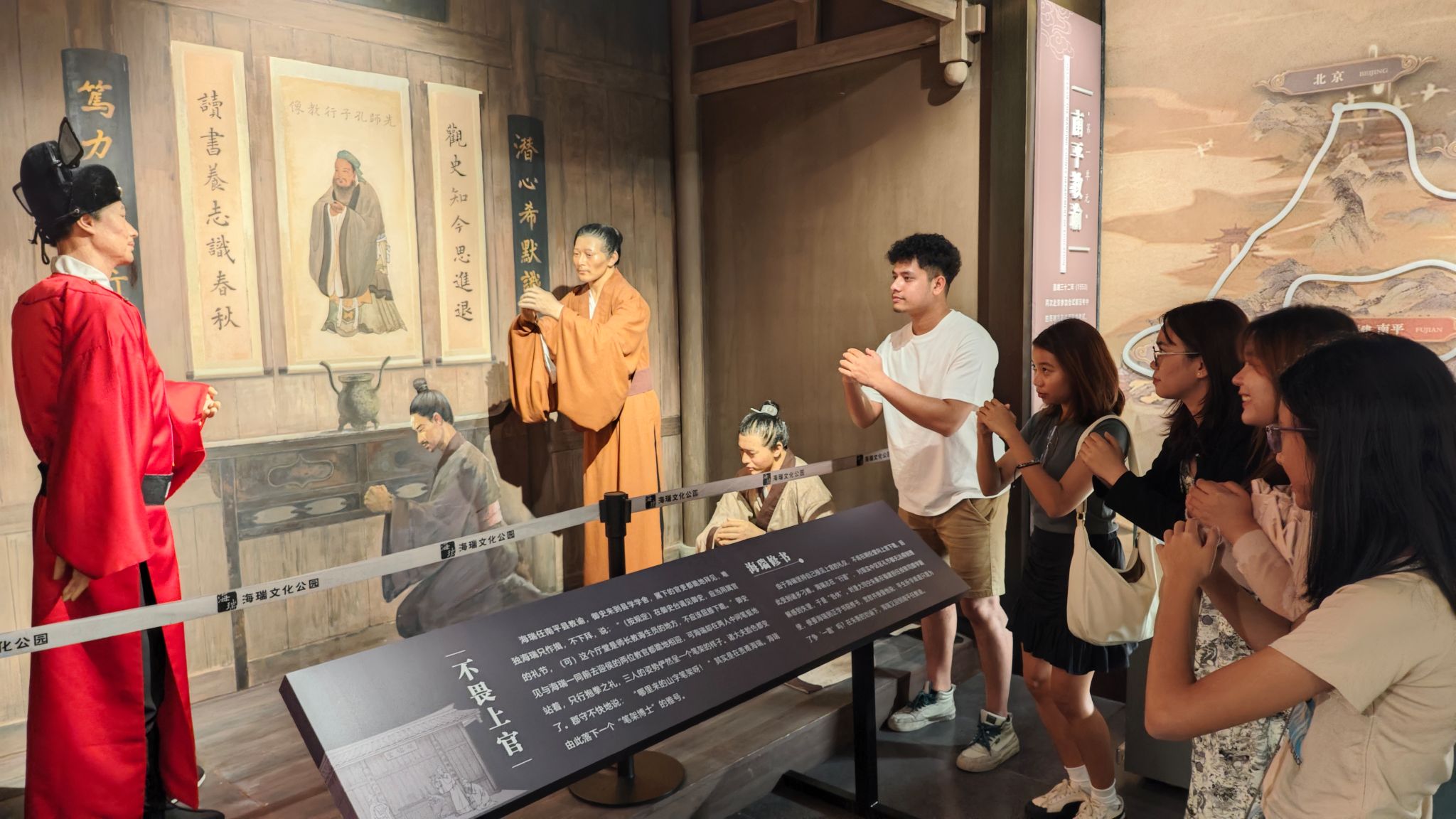 研学团还组织同学们来到省会海口,参观了海瑞纪念馆、海南博物馆、云洞图书馆和骑楼老街等地。在海瑞纪念馆,同学们详细了解了海瑞的生平事迹、政治理念和廉洁精神。老师们现场讲解中国“廉政文化”的历史传承和新时代内涵,以“海青天”为代表的正直清廉、刚直不阿、胸怀众生的廉洁精神,打动了各国留学生们。在骑楼老街,同学们三五成群地徜徉在一栋栋南洋风格的古建筑群中,仿佛在倾听着海口100多年来的前世今生,与中国的传统文化和现代文明进行着深入对话。