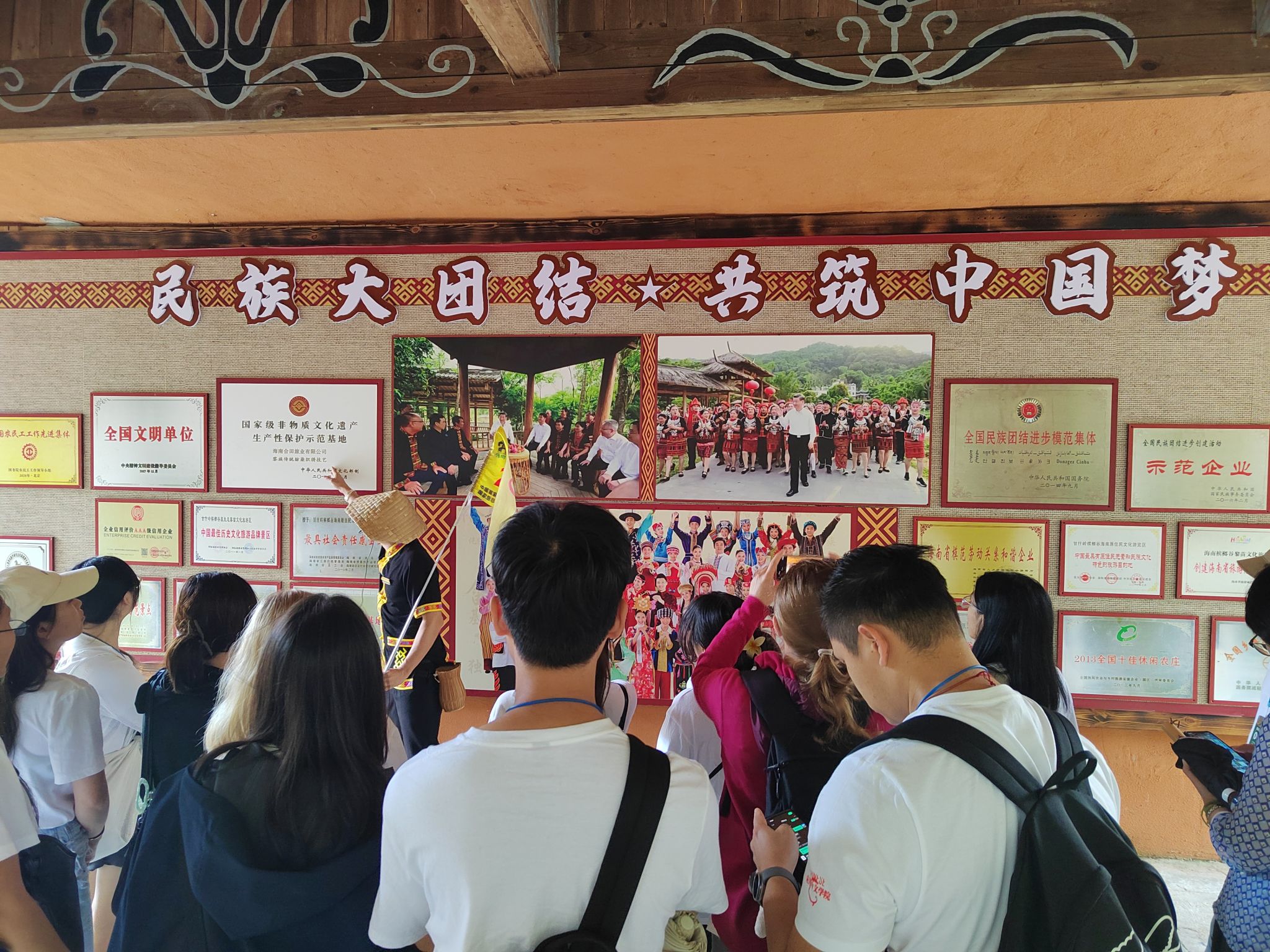 在槟榔谷黎寨,同学们与黎族阿哥阿姐热情交流,学习黎苗文化的历史传承和风俗习惯,了解中国的民族大团结政策,欣赏黎族传统纺染织绣等非物质文化遗产技艺,也真切体验到过去处于穷乡僻壤的黎寨通过乡村振兴政策走上了特色发展的富裕幸福之路。看到几位年过八旬的黎族老奶奶依然巧手翻飞、忙织黎锦的场面,同学们赞叹不已。随后亲身体验火辣辣的黎族药膏,品尝黎家美食簸箕餐,更是让同学们感受到中国少数民族文化的独特魅力。