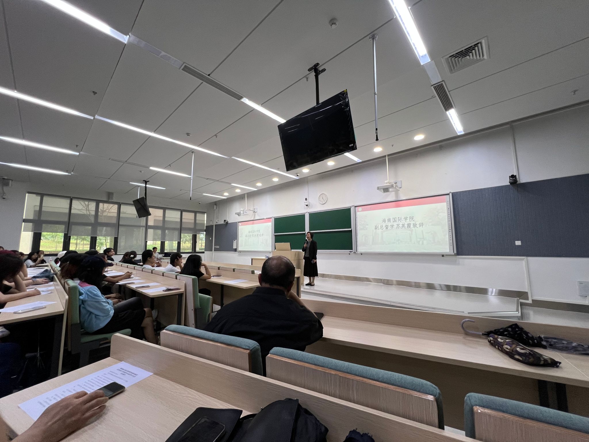 海南国际学院总督学郁有学、副总督学苏英霞、党工委书记仵志勇、国际中文学院党委副书记别红樱出席并讲话。各位领导对大家的到来表示热烈欢迎,希望大家以积极乐观的心态尽快适应环境,开启新生活。会上还详细介绍了教学安排和园区规章制度及安全注意事项等。