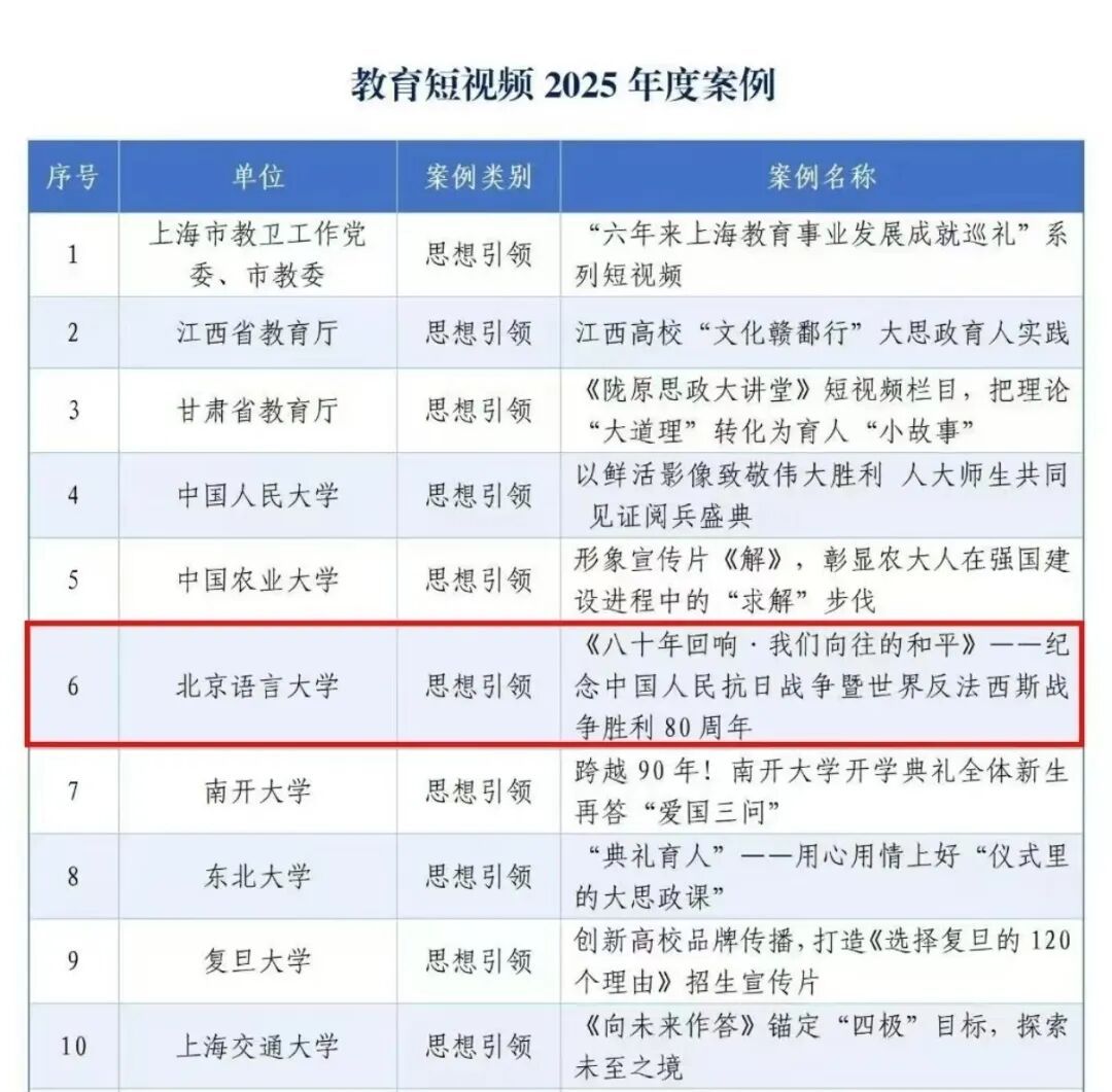 近日,我校报送的《八十年回响·我们向往的和平——纪念中国人民抗日战争暨世界反法西斯战争胜利80周年》融媒体报道成功入选教育部新闻办公室指导、教育部宣传教育中心主办的“教育短视频2025年度案例”。这一成绩的取得,是对91自拍