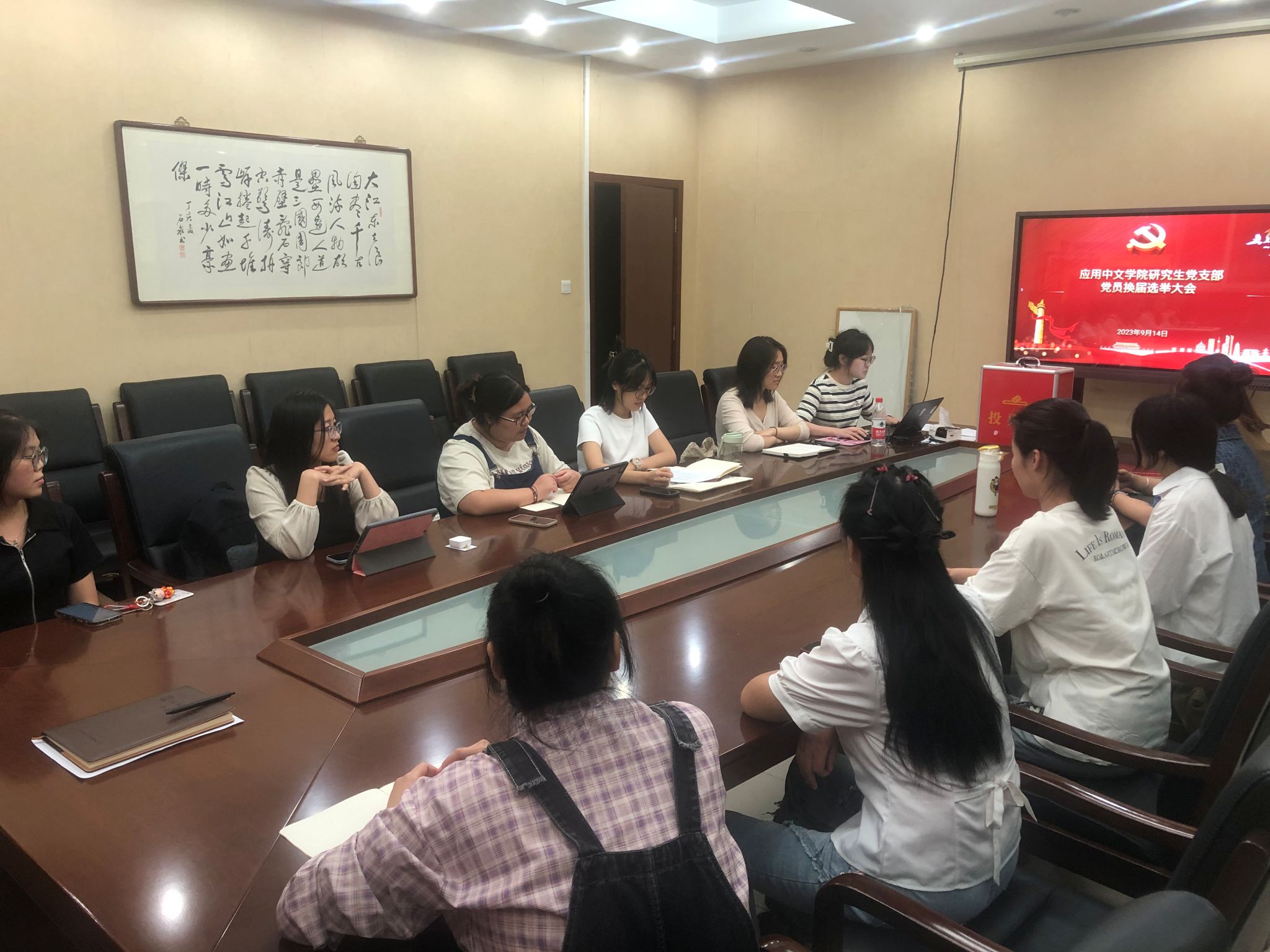 研究生支部支委换届选举大会在教三楼124会议室召开。本次会议由原支部书记黄灿同志主持,学院党委副书记白浩同志列席,参加会议的有正式党员12人,预备党员2人,2人请假。