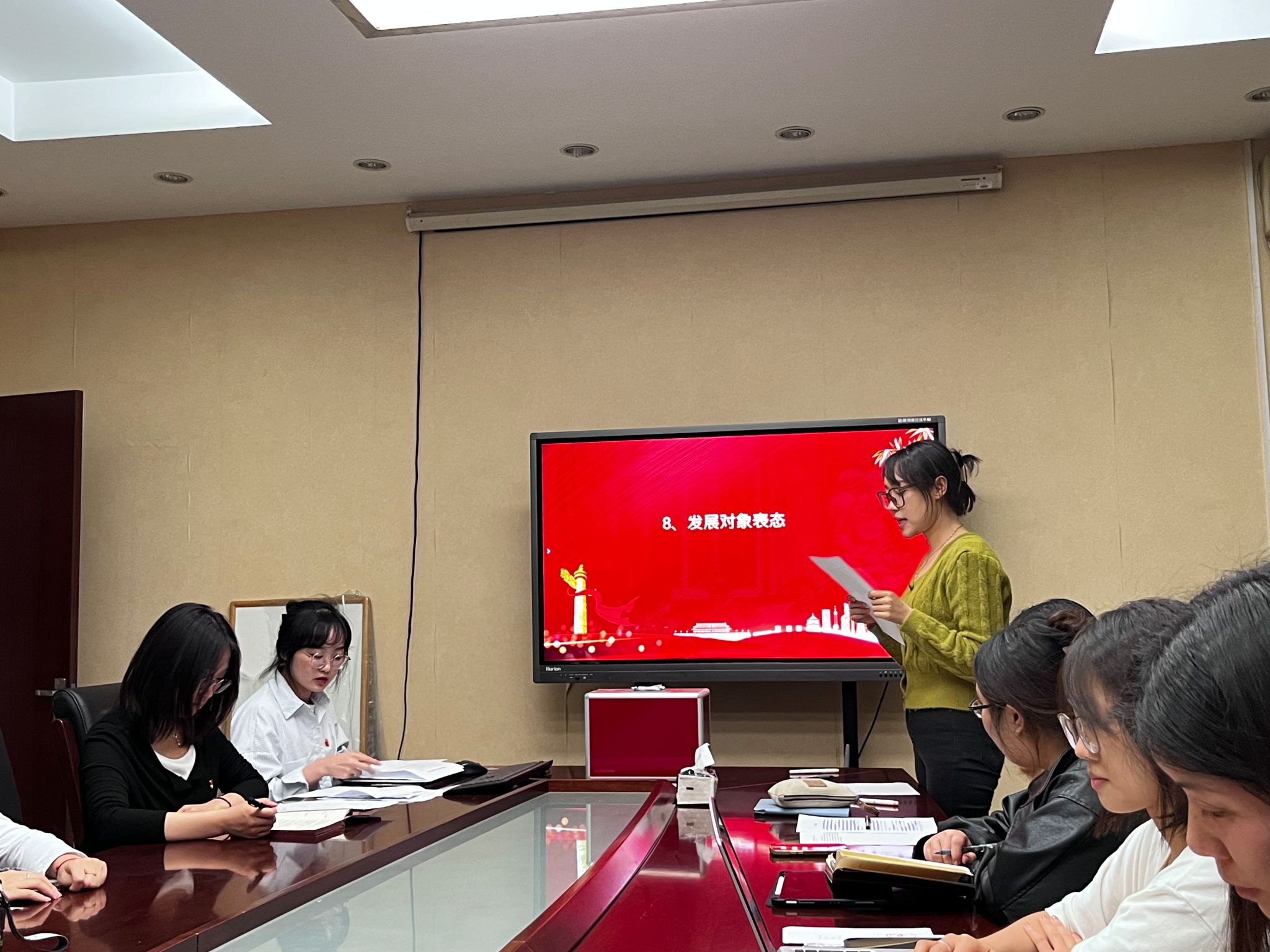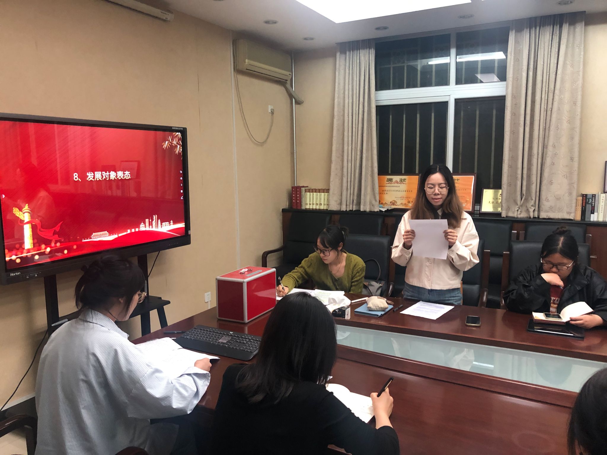 按照《中国共产党发展党员工作细则》等相关规定要求,支部书记黄灿依次主持了武玉君、赵婕两位同学的发展接收程序。她首先介绍了基本情况;接着,由发展对象本人汇报个人情况,对党的认识、入党动机、个人履历、家庭主要社会关系情况进行了详细的说明;然后,第一入党介绍人黄灿和第二入党介绍人焦宇倩同志就发展对象的情况发表意见。接着,组织委员牛世超代表支委会对其审查情况进行说明;随后,与会党员就发展对象能否入党展开了充分的讨论,焦宇倩、徐牧渊、罗红、朱冬静等同志皆发表个人意见,同意其入党;会议进行了严格的投票程序,经无记名投票表决,全票同意接收两位同志为预备党员。两位预备党员也表示将始终坚定信仰,为共产主义事业而奋斗终身。最后,周鑫书记结合具体情况对此次会议进行总结讲话,主要提出了三点要求和期望:一是坚持“不忘初心,牢记使命”;二是全体党员同志需加强学习:三是全体党员同志需踏实工作。会议在全体党员同志奏唱雄壮的《国际歌》中结束。