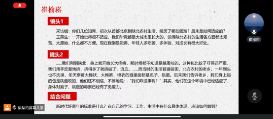 第二,崔榆崧同学从该书的两处镜头入手,结合自身经历,阐释了新时代好青年的标准是什么,自己在学习、工作、生活中又应如何实现。