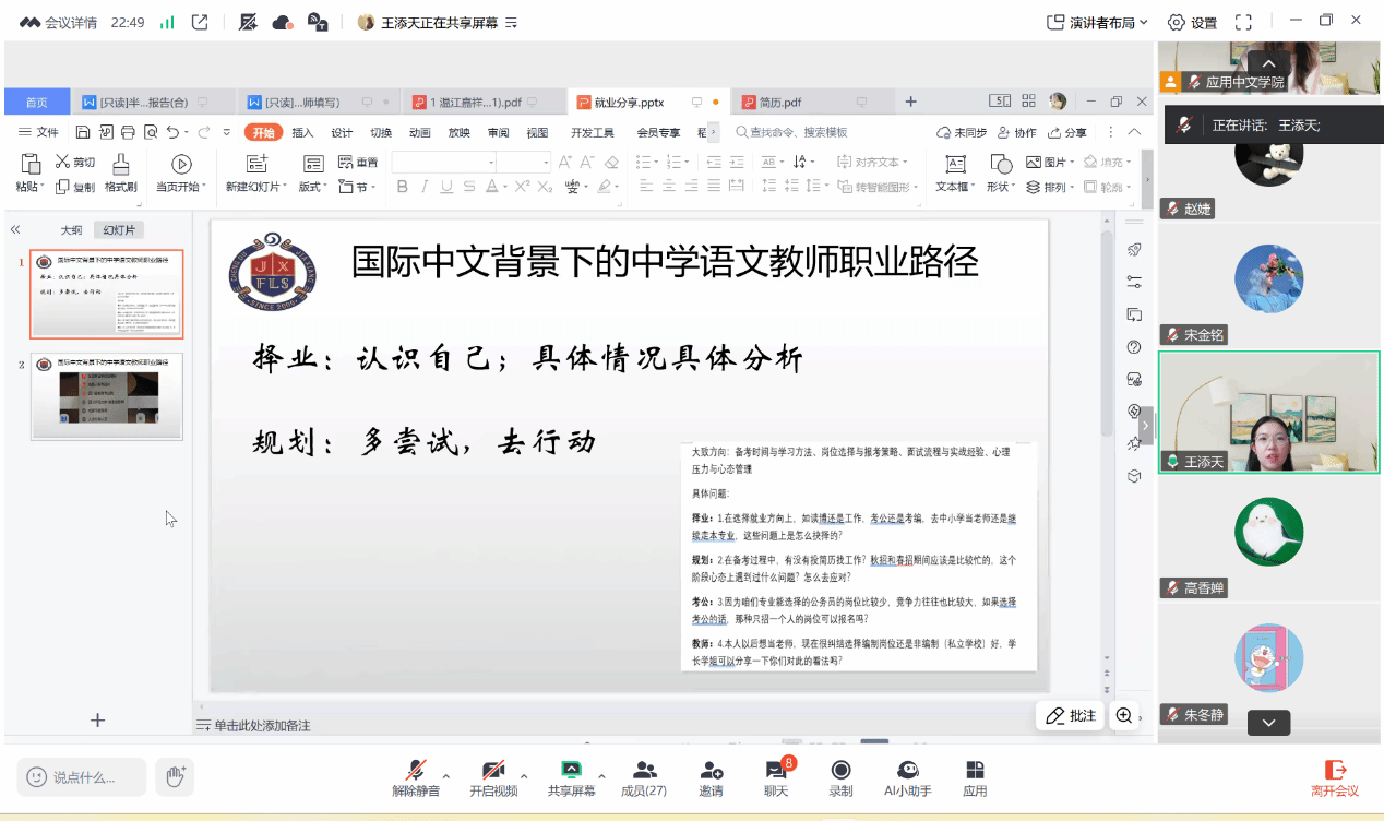 王添天(2025届硕士,成都某重点中学语文教师)结合求职经历,提醒同学多实习、多试讲,在实践中明确方向。