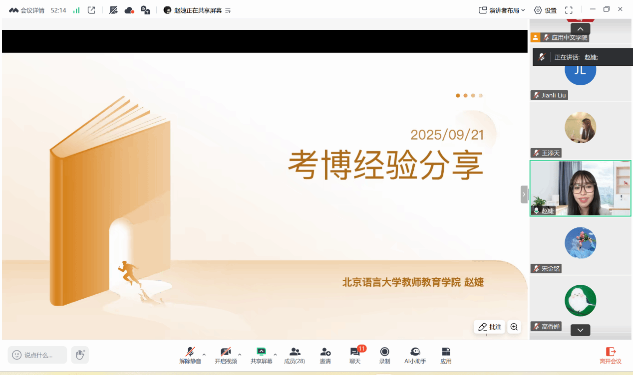 赵婕(2024届硕士,本校博士生)说明读博动机、申请流程与心理调适,强调“学术是长跑,平衡最重要”。