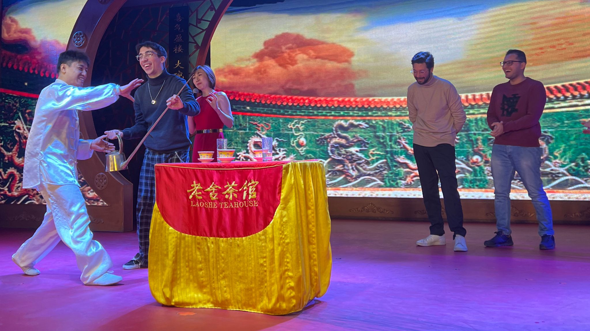 走进老舍茶馆的大门,同学们立即就被传统韵味十足的环境吸引住了。大大的灯笼兔爷、脚下的木质楼梯、顶上的华丽宫灯,令同学们惊叹不已,对接下来的演出充满期待。