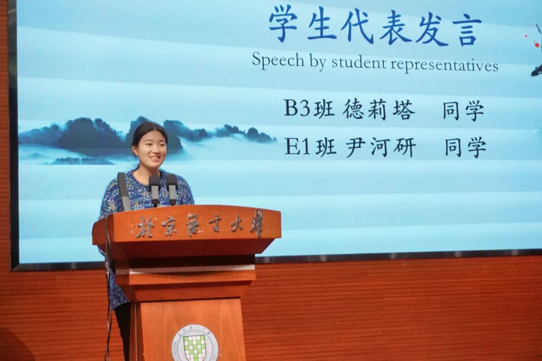 接下来教师代表蔡楠老师、学生代表德莉塔和尹河研也做了本学期的总结汇报,强调了学习、友情和生活等方面的重要收获。